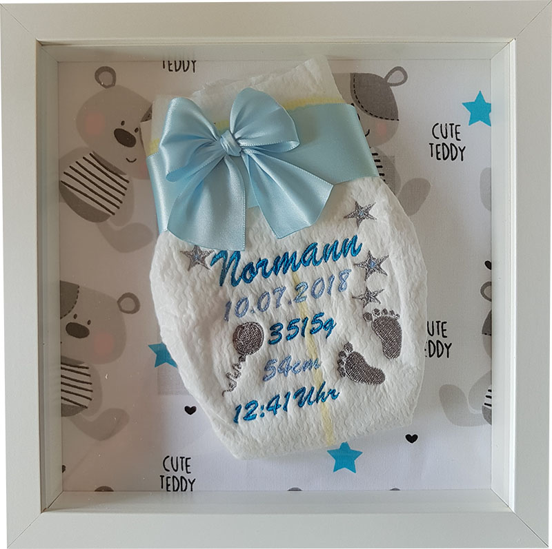 Wir haben uns aber auch schon Gedanken darüber gemacht, was wir meiner Schwägerin zur Geburt schenken sollen. Und da sind wir auf die tolle Idee gekommen ihr eine mit dem Namen und den Geburtsdaten bestickte Windel im Rahmen zu kaufen.